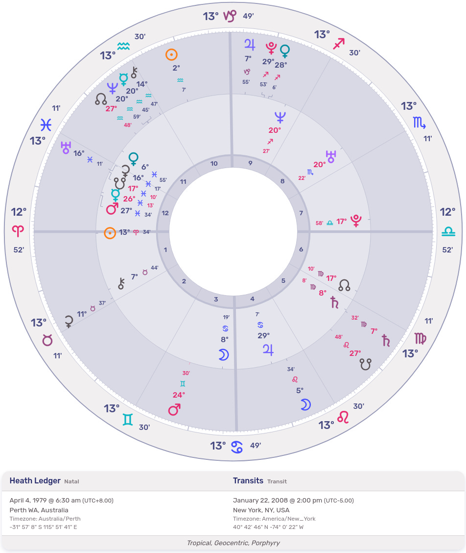 Was this the case in Ledger's life? The question is complicated by the fact that Mercury, Venus and Mars are far from a close conjunction with the South Node. But we have an ace up our sleeve: biographical facts from the life lived.