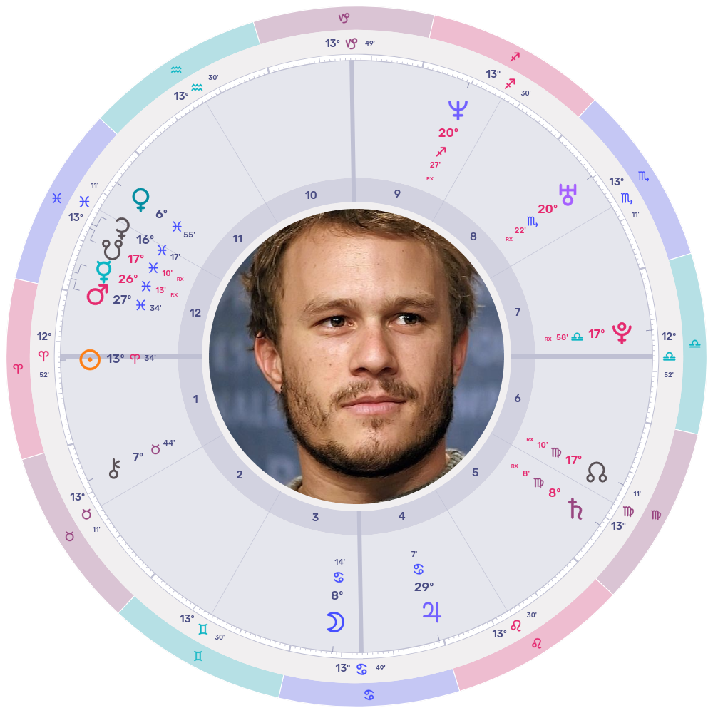 Ledger was uncomfortable with stardom: with the Sun conjunct the Ascendant, he was forced to become conscious of himself in a way that he was not prepared for. He sought to avoid the biggest roles that would have easily propelled him to superstardom, even when he could have got them. The Sun placement had a function of forcing him to become more and more self-aware, undercutting his drive to disappear into a role.